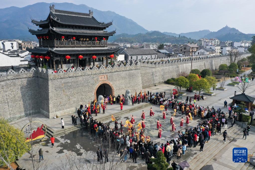 1月24日,市民和游客在嚴州古城開(kāi)城儀式現場(chǎng)觀(guān)看傳統民俗表演(無(wú)人機照片)。