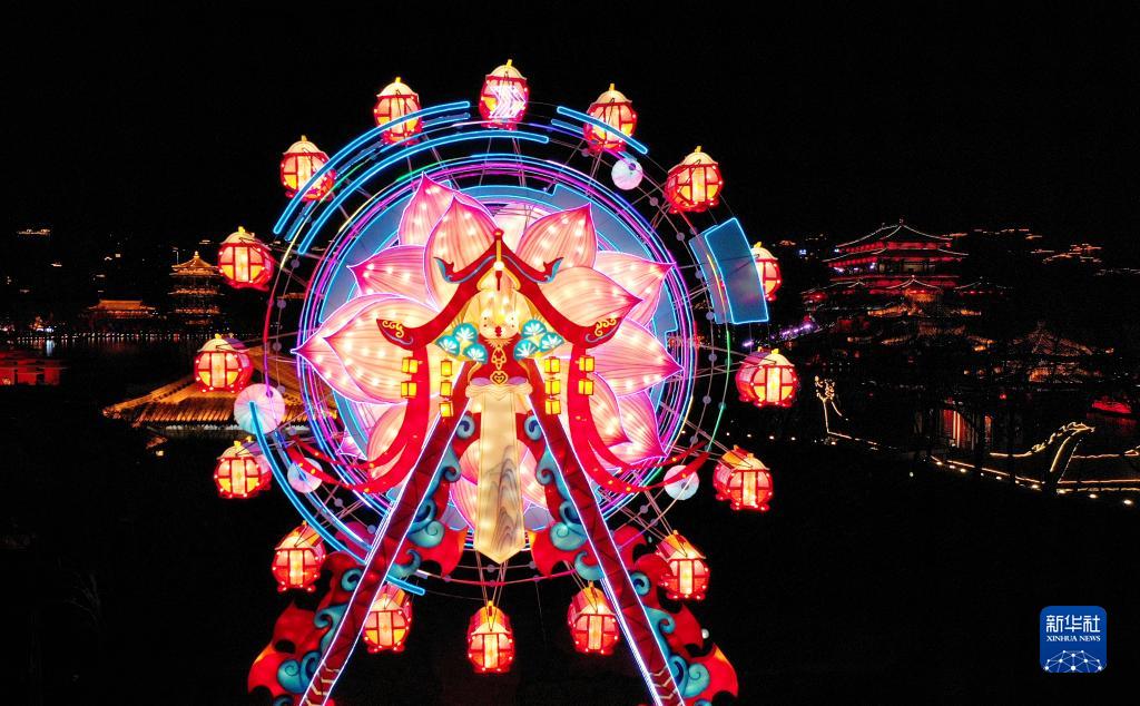 夜幕降臨,西安大唐芙蓉園內萬(wàn)盞花燈璀璨綻放,在仿唐式園林的亭臺樓閣、廊橋水波之間,燈與景交相輝映,美輪美奐。