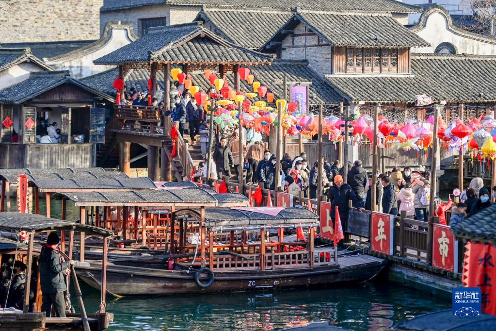 1月25日,游客在浙江省桐鄉市烏鎮景區逛“水上年市”。