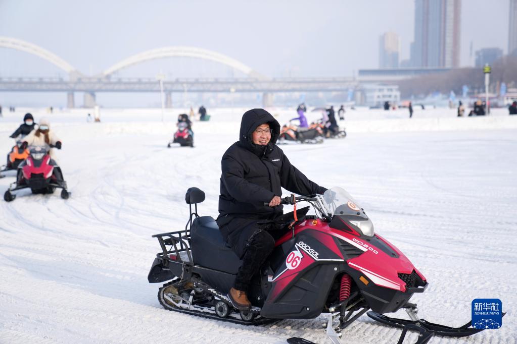 1月22日,游客在哈爾濱松花江冰雪嘉年華園區內體驗冰雪娛樂(lè )項目。