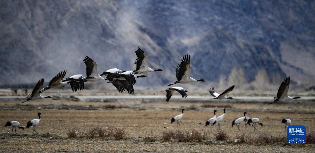 在西藏雅魯藏布江中游河谷黑頸鶴國家級自然保護區日喀則片區拉孜縣附近,大量越冬的黑頸鶴翩翩起舞,迎接春天的到來(lái)。