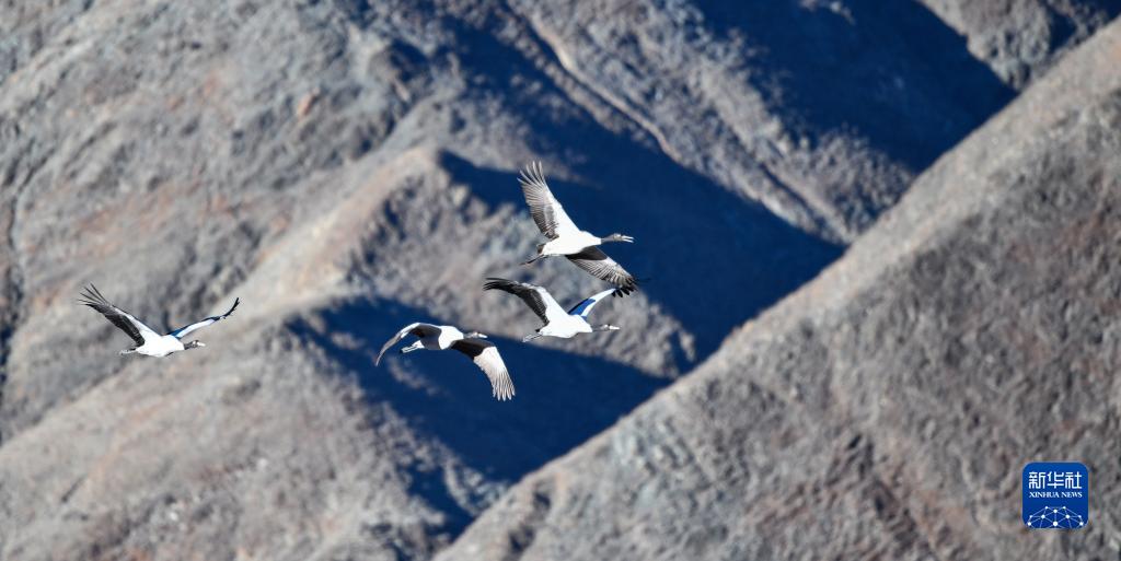 在西藏雅魯藏布江中游河谷黑頸鶴國家級自然保護區日喀則片區拉孜縣附近,大量越冬的黑頸鶴翩翩起舞,迎接春天的到來(lái)。