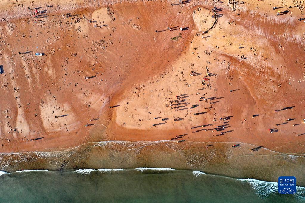 1月25日,游客在廣西防城港市的海灘游玩(無(wú)人機照片)。