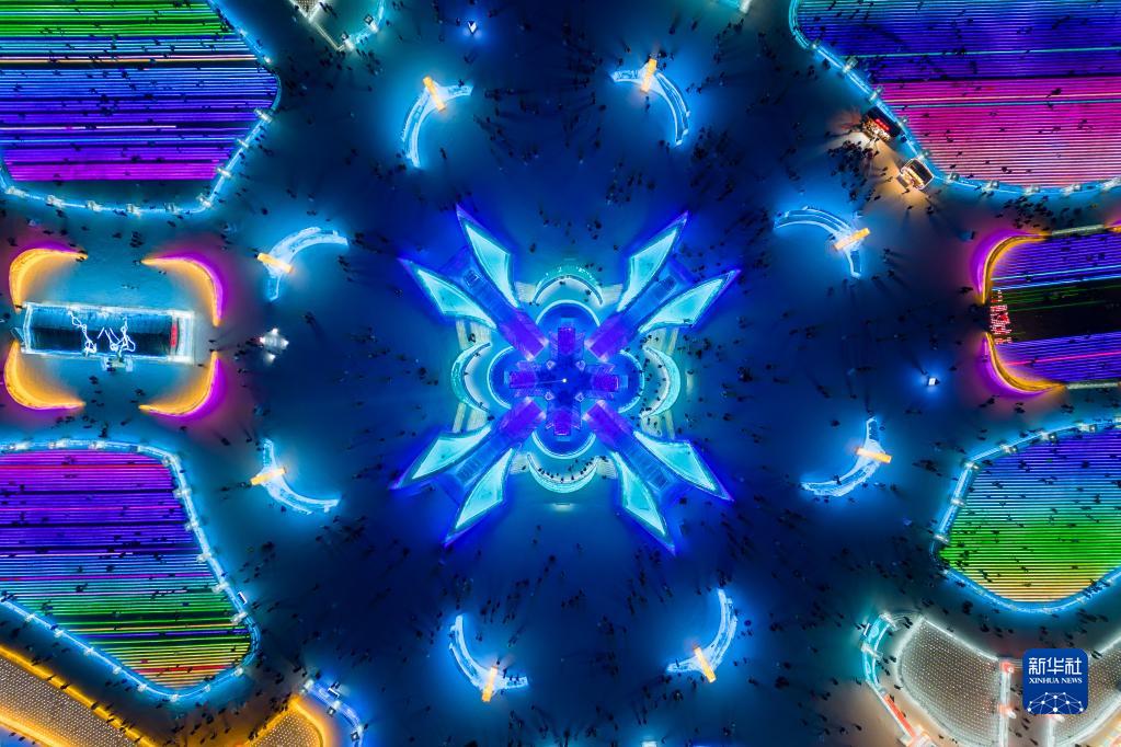 這是1月25日拍攝的哈爾濱冰雪大世界園區夜景(無(wú)人機照片)。