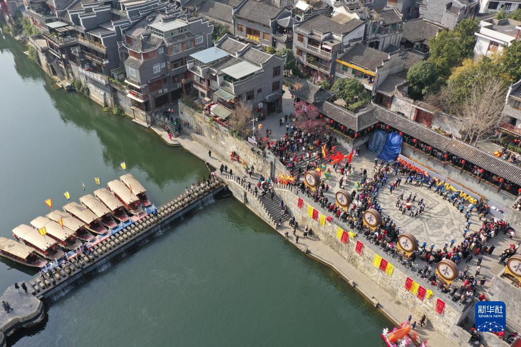 1月24日,在湖南省湘西土家族苗族自治州吉首市乾州古城,民間藝人在進(jìn)行游春表演(無(wú)人機照片)。