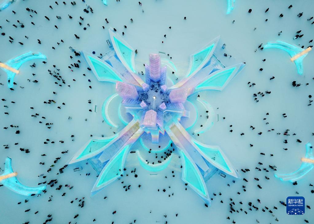 1月25日,游客在哈爾濱冰雪大世界園區內游玩(無(wú)人機照片)。