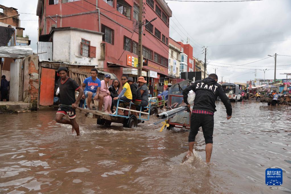 1月25日,在馬達加斯加首都塔那那利佛,行人走過(guò)積水的道路。