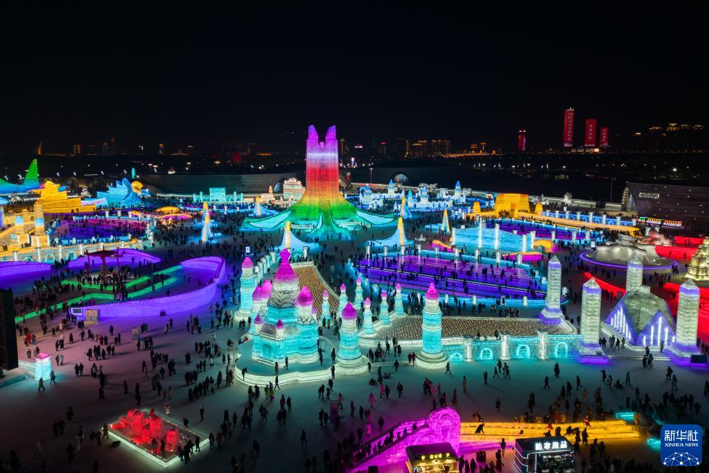 1月25日,游客在哈爾濱冰雪大世界園區內游玩(無(wú)人機照片)。