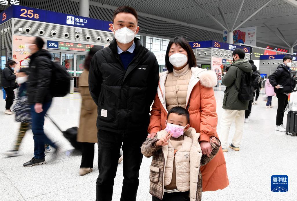 河南省周口市沈丘縣人崔偉(左)和愛(ài)人劉虹、兒子崔堇揚在鄭州東站候車(chē)大廳內候車(chē),準備去往成都(1月26日攝)。由于各種原因,崔偉已經(jīng)十幾年沒(méi)能回老家過(guò)春節了,以前坐綠皮車(chē)回家要二十幾個(gè)小時(shí),現在乘高鐵只要七八個(gè)小時(shí)就能到達。