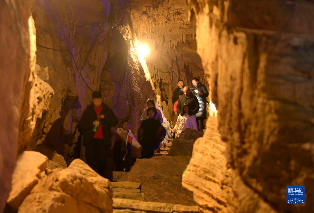 1月27日,游客在湖北省宣恩縣鑼圈巖地質(zhì)公園體驗洞穴探險。