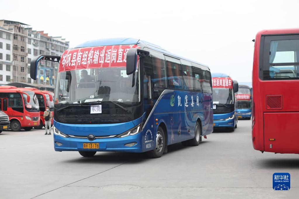 1月27日,在黔東南苗族侗族自治州岑鞏縣汽車(chē)站,返崗群眾集中乘坐政府包車(chē)前往外地務(wù)工。