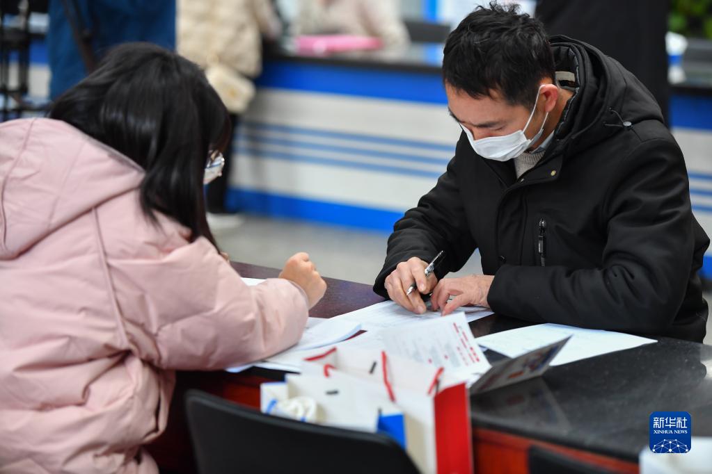 1月28日,在長(cháng)沙市人力資源市場(chǎng),求職者(右)在填寫(xiě)應聘信息表。