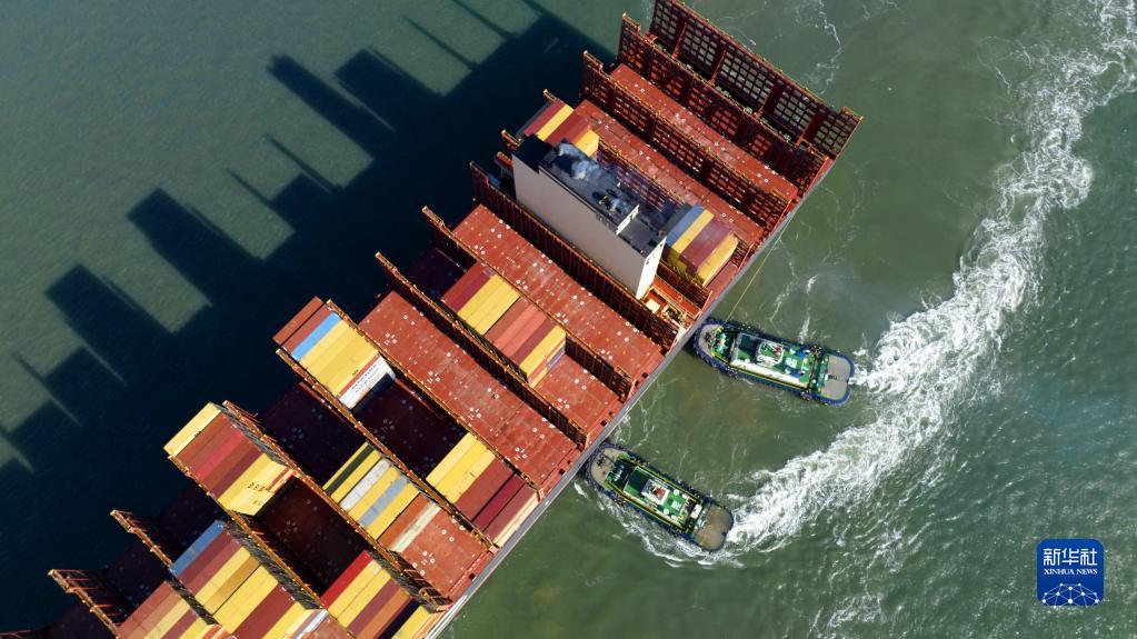 1月27日,一艘集裝箱貨輪在拖輪協(xié)助下靠泊青島港前灣集裝箱碼頭(無(wú)人機照片)。