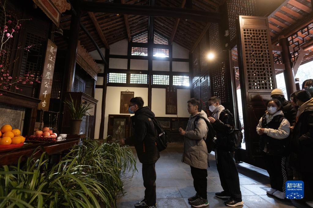 1月28日,在四川成都杜甫草堂工部祠,人們手捧紅梅祭拜杜甫。