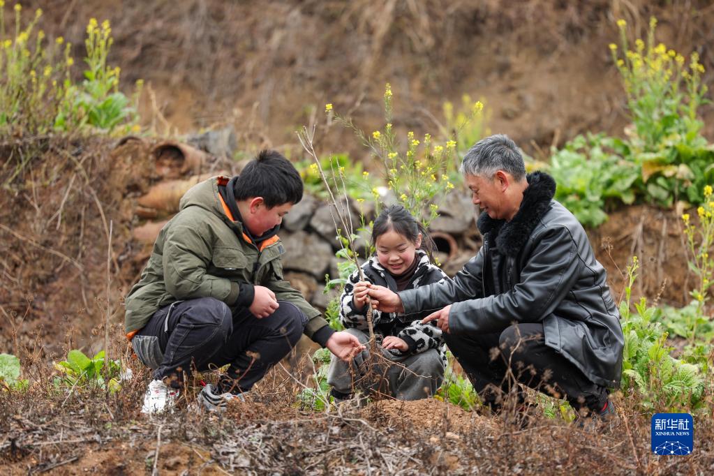 1月28日,在貴州省畢節市赫章縣平山鎮對江社區,家長(cháng)給孩子講授植樹(shù)知識。