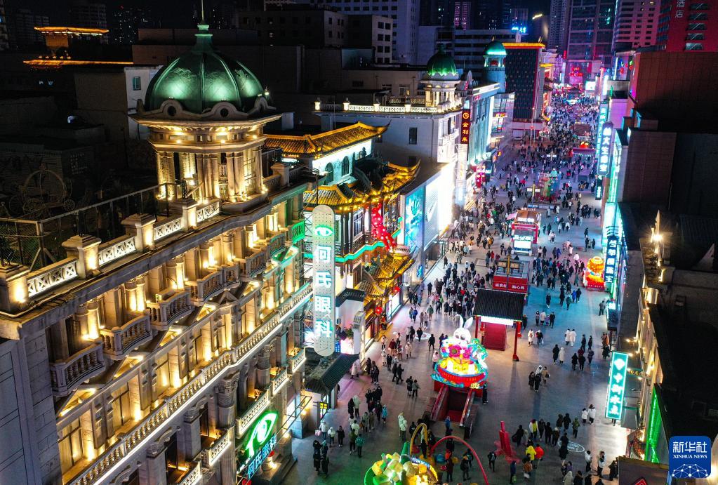 1月25日,市民在沈陽(yáng)中街商業(yè)街上休閑購物(無(wú)人機照片)。