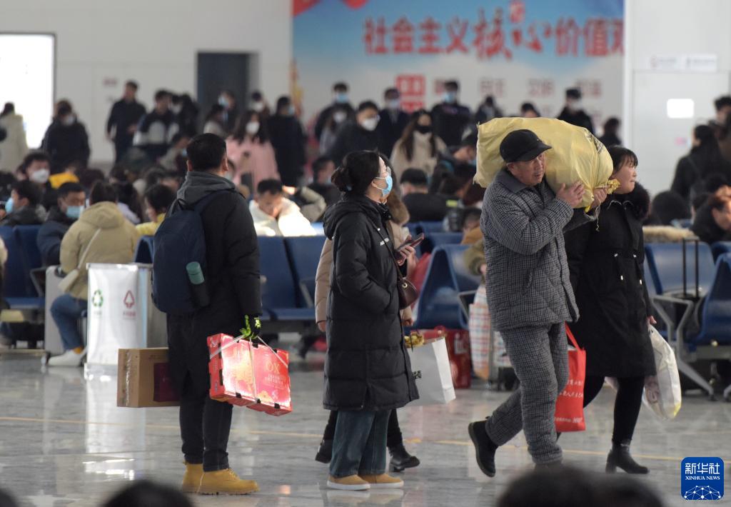 1月27日,在安徽阜陽(yáng)西站,旅客進(jìn)站準備乘車(chē)。