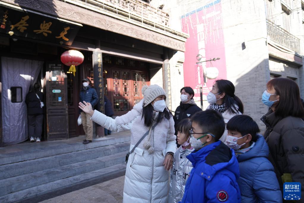 1月28日,在北京市東城區鮮魚(yú)口街,導游何靜(左一)在為游客講解。