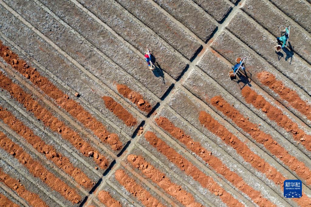 1月29日,江西省豐城市白土鎮隱溪村的油茶種植戶(hù)在田間培育苗床,準備栽種油茶苗(無(wú)人機照片)。