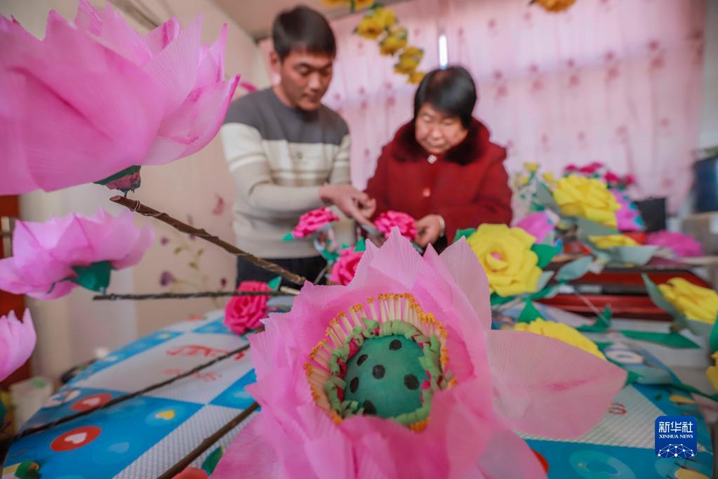 1月28日,遷西縣灑河橋鎮的民間藝人在趕制元宵節演出的跑花燈。