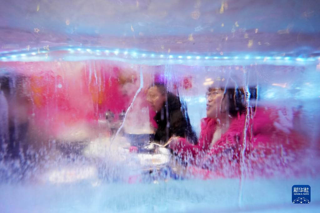 1月28日,游客在哈爾濱中央大街的“冰屋”內品嘗“冰屋火鍋”。
