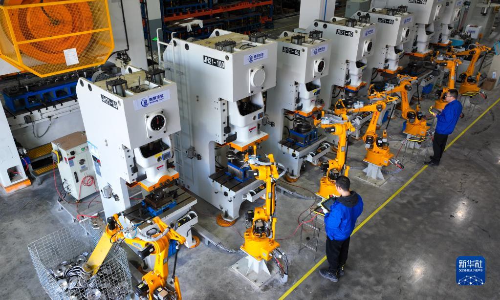 1月29日,在浙江省湖州市德清縣鐘管鎮的浙江南泵流體機械有限公司生產(chǎn)車(chē)間內,工人在監測自動(dòng)沖壓線(xiàn)機械手工作情況,趕制水泵零配件(無(wú)人機照片)。