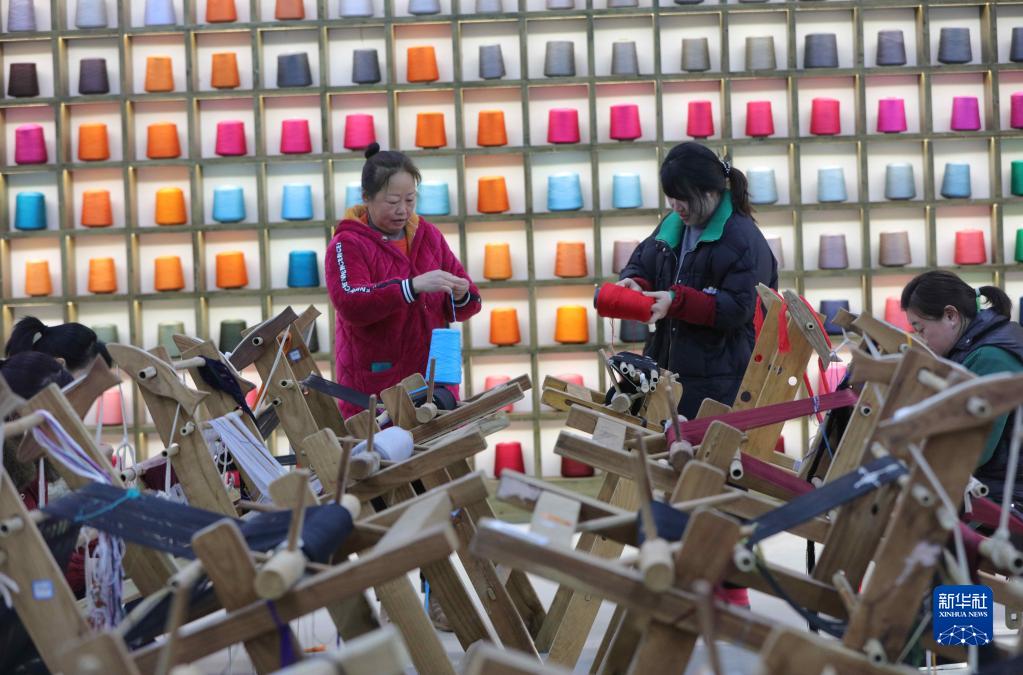 1月29日,在湖南省張家界市武陵源區乖幺妹土家族織錦生產(chǎn)研發(fā)基地,工人在制作土家族織錦產(chǎn)品。