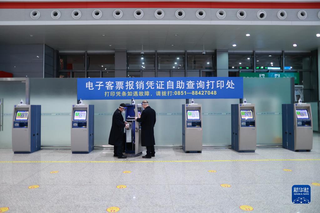 1月29日,設備檢修人員在貴陽(yáng)北站維護電子客票報銷(xiāo)憑證打印設備。