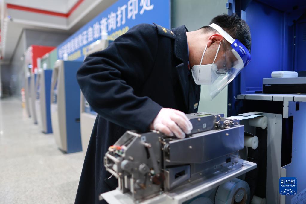 1月29日,設備檢修人員在貴陽(yáng)北站維護電子客票報銷(xiāo)憑證打印設備。