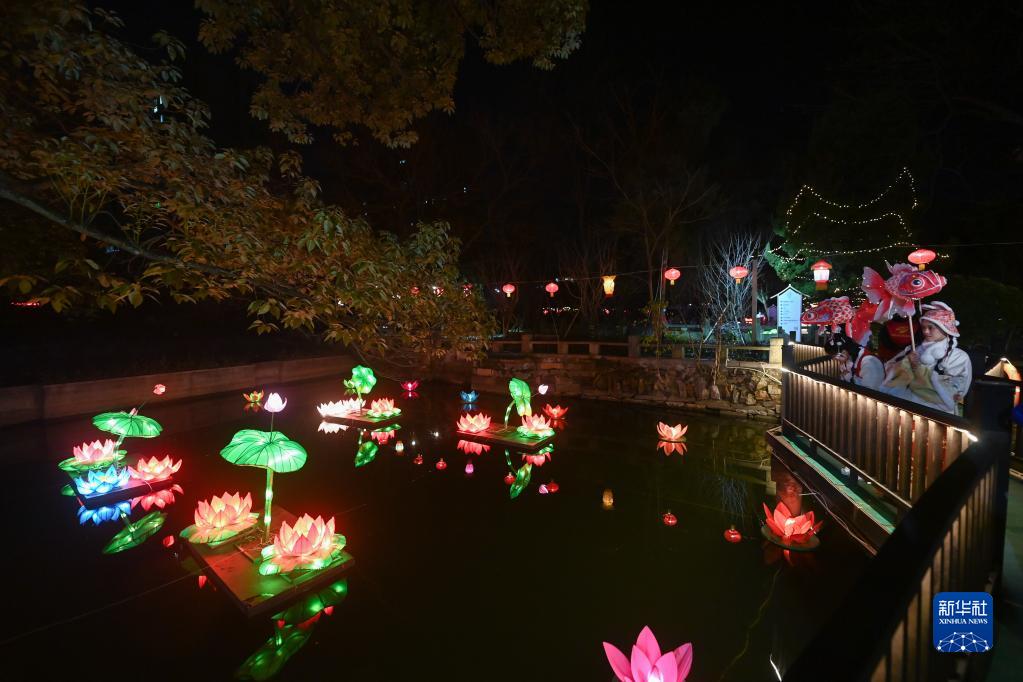 1月29日,在嘉興市秀洲區新塍古鎮小蓬萊公園內,人們前來(lái)觀(guān)賞“鰲山燈會(huì )”的彩燈。