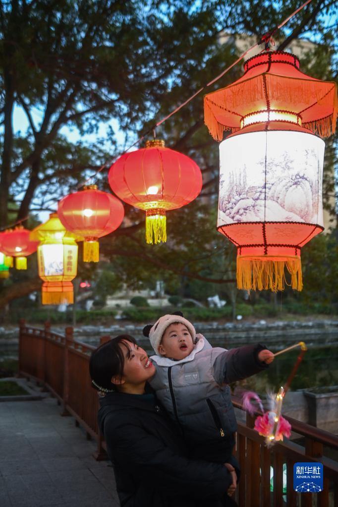 1月29日,在嘉興市秀洲區新塍古鎮小蓬萊公園內,一位家長(cháng)帶著(zhù)孩子在觀(guān)賞“鰲山燈會(huì )”的彩燈。