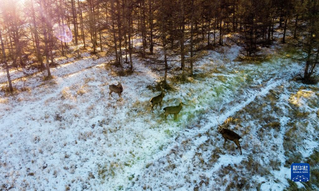 1月29日,一群馬鹿在灤河源國家森林公園內覓食(無(wú)人機照片)。新華社記者 賀書(shū)琛 攝
