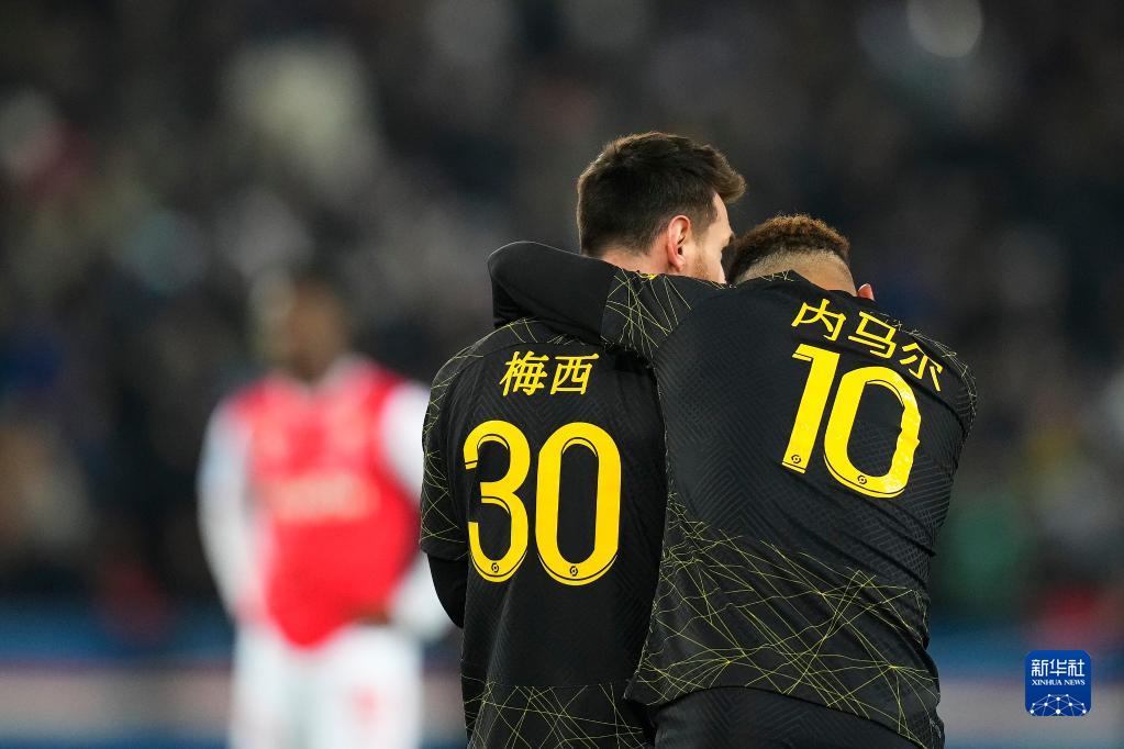 1月29日,在法國巴黎王子公園球場(chǎng),巴黎圣日耳曼隊球員梅西(左)和隊友內馬爾身著(zhù)印有中文名字的隊服。