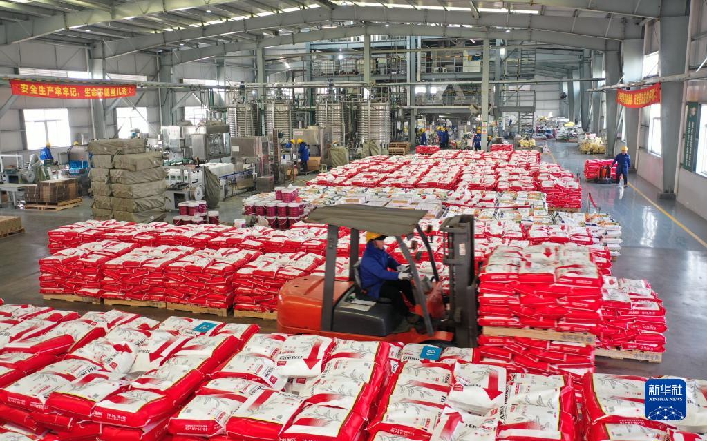 1月29日,四川一家公司員工用叉車(chē)搬運化肥(無(wú)人機照片)。