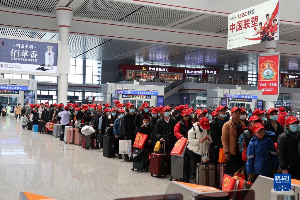1月30日,D2879次務(wù)工專(zhuān)列旅客在貴陽(yáng)北站排隊乘車(chē)。