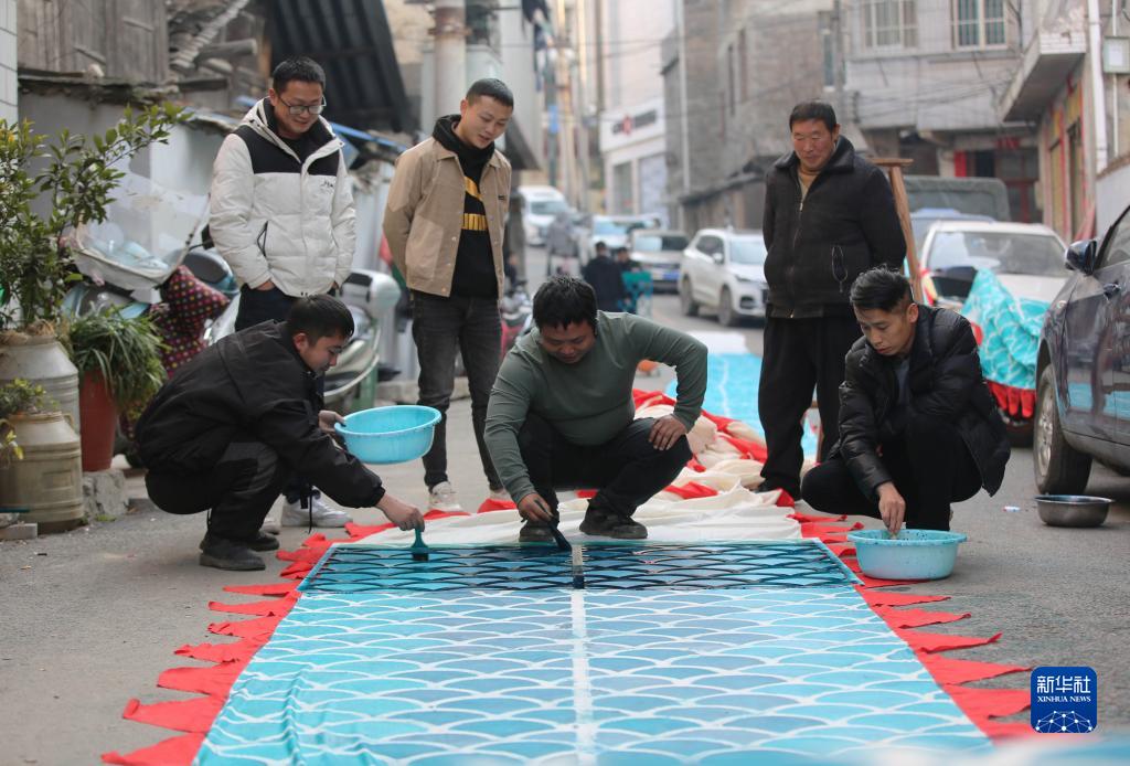 1月29日,民間藝人在貴州省黔東南苗族侗族自治州臺江縣臺拱街道文山村給“亮龍”的龍身添色。