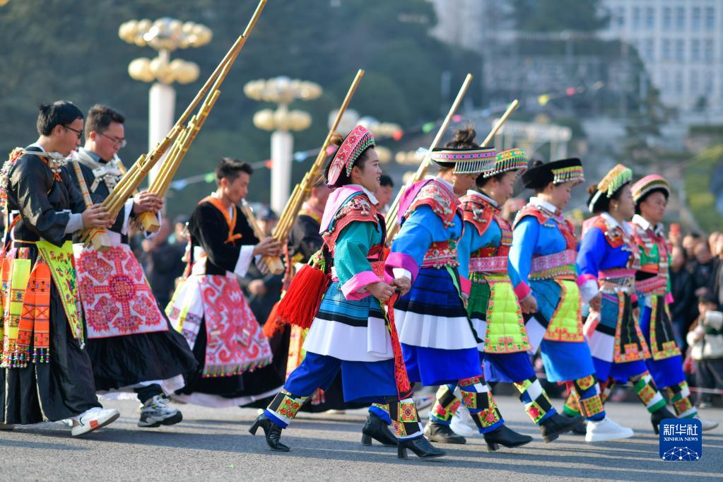 當日是正月初九,貴州省黔南布依族苗族自治州龍里縣舉辦傳統民俗“踩街”活動(dòng),通過(guò)花燈巡演、花棍舞、蘆笙舞、舞龍舞獅等民俗活動(dòng),歡度新春。