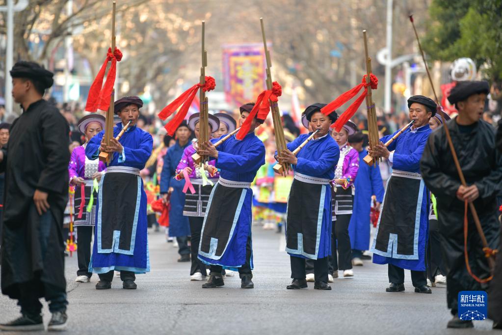 當日是正月初九,貴州省黔南布依族苗族自治州龍里縣舉辦傳統民俗“踩街”活動(dòng),通過(guò)花燈巡演、花棍舞、蘆笙舞、舞龍舞獅等民俗活動(dòng),歡度新春。