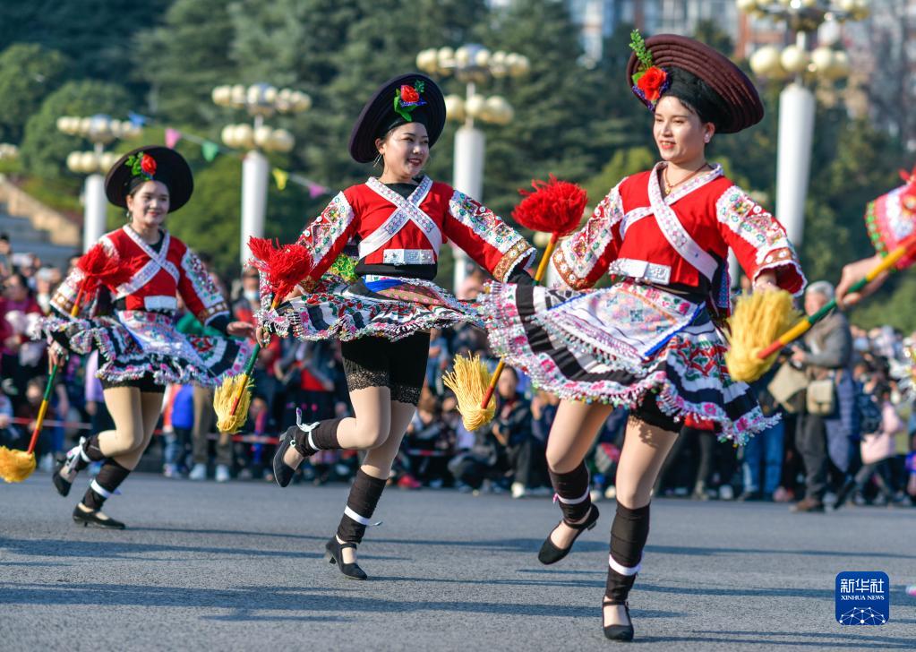 當日是正月初九,貴州省黔南布依族苗族自治州龍里縣舉辦傳統民俗“踩街”活動(dòng),通過(guò)花燈巡演、花棍舞、蘆笙舞、舞龍舞獅等民俗活動(dòng),歡度新春。