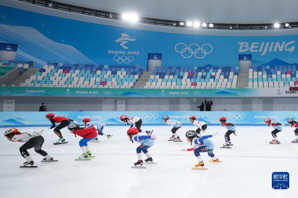 2023年1月6日,小朋友們在國家速滑館進(jìn)行短道速滑訓練展示。