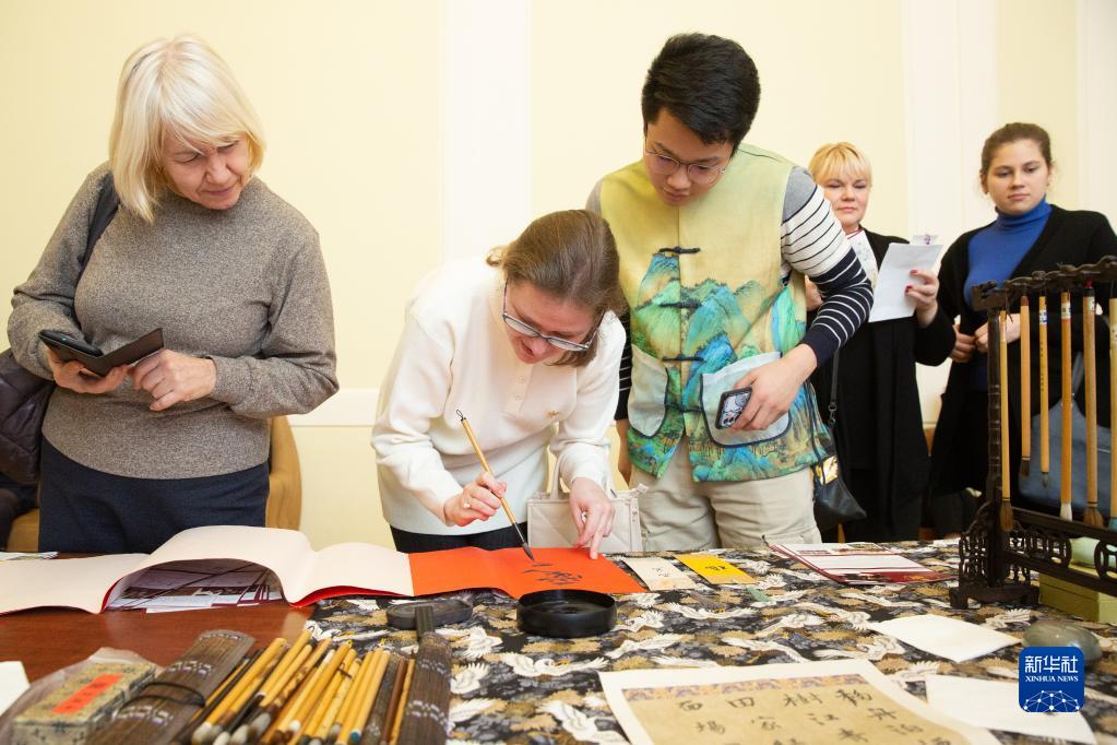 1月30日,在俄羅斯圣彼得堡凱瑟琳禮堂,當地市民體驗中國書(shū)法。