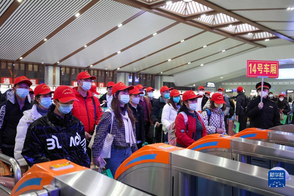 1月31日,務(wù)工人員在畢節高鐵站閘機口前排隊候車(chē)。