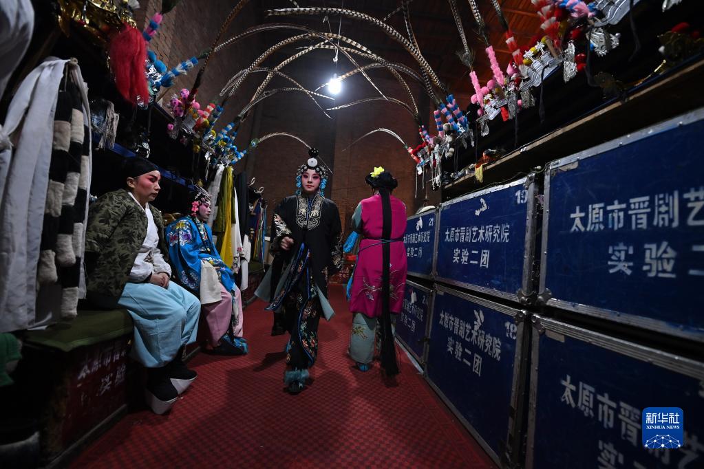 1月30日,在山西省太原市清徐縣孟封村,太原市晉劇藝術(shù)研究院實(shí)驗二團演員在后臺準備上場(chǎng)。