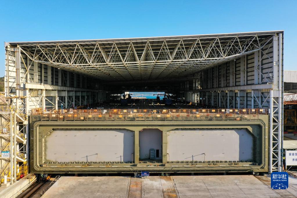 這是在中交四航局珠海牛頭島沉管智慧工廠(chǎng)拍攝的深中通道海底隧道最后一個(gè)管節(非標準管節、含最終接頭)(1月30日攝,無(wú)人機照片)。