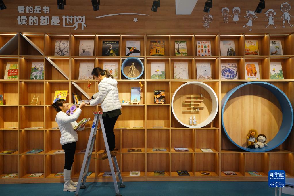 1月31日,在重慶市北碚區一家幼兒園,兩名教師在整理校園讀書(shū)角。