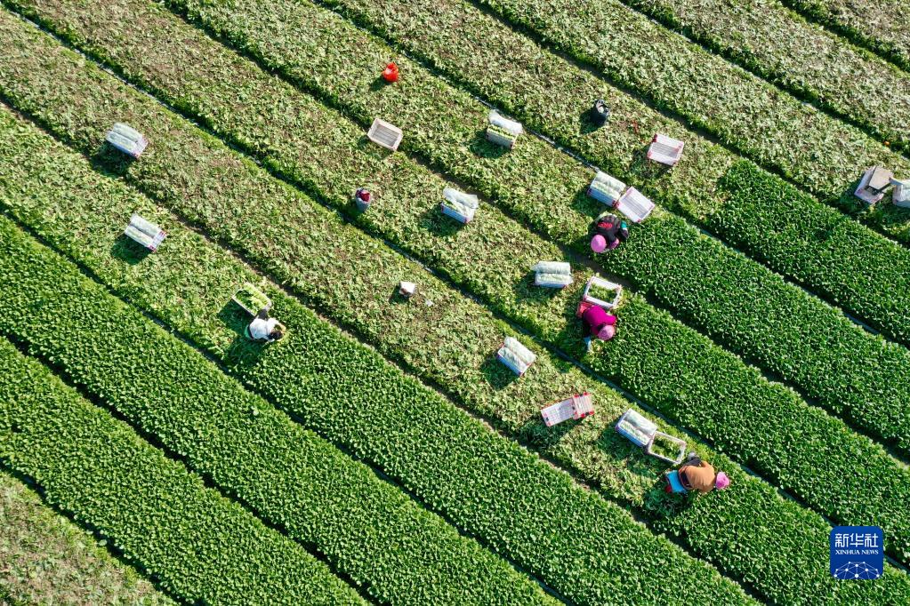 福州市閩侯縣南通鎮的菜農在采收蔬菜(1月30日攝,無(wú)人機照片)。