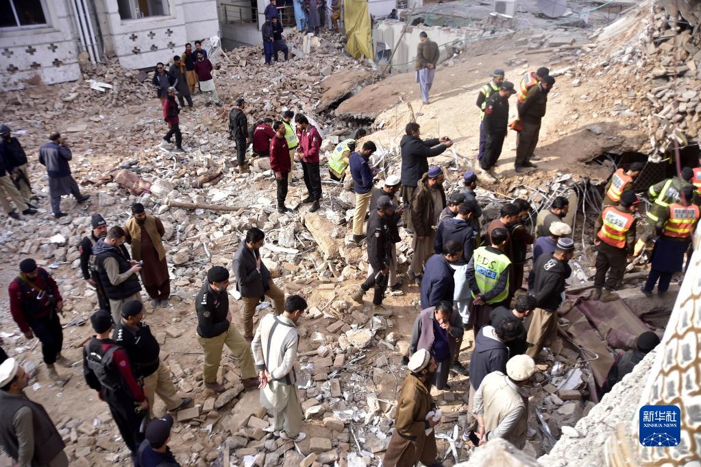 1月31日,在巴基斯坦白沙瓦,救援人員和安全人員查看爆炸襲擊現場(chǎng)。