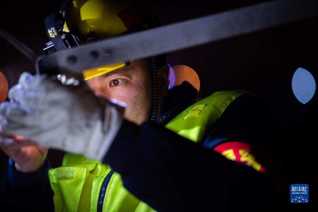 鐵路接觸網(wǎng)供電設備是否正常運轉,關(guān)系著(zhù)每趟列車(chē)的安全運行。春運期間,中國鐵路武漢局集團有限公司武漢供電段高鐵接觸網(wǎng)檢修工人利用0點(diǎn)到6點(diǎn)的“天窗點(diǎn)”,頭戴安全帽、身穿反光服,對京廣高鐵武漢段的接觸網(wǎng)進(jìn)行檢修、維護,為高鐵供電保駕護航。