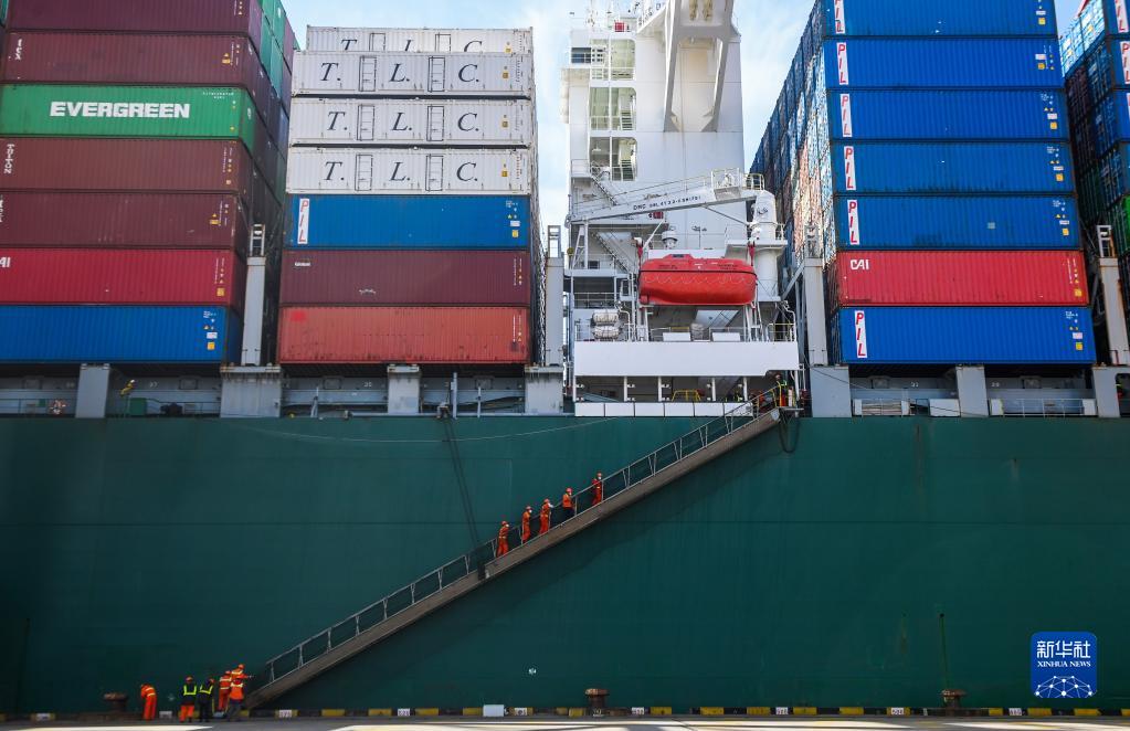 1月31日,在寧波舟山港金塘港區大浦口集裝箱碼頭,工作人員登上集裝箱貨輪協(xié)助裝卸集裝箱。