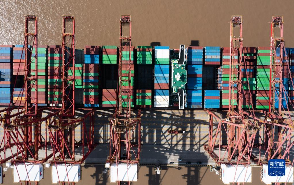 在寧波舟山港金塘港區大浦口集裝箱碼頭,一艘貨輪正在碼頭卸貨(1月31日無(wú)人機拍攝)。